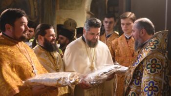 Після урочистого молебню митрополит Вінницький і Барський Симеон від імені Священного Синоду та повноти Православної Церкви України висловив вітання на адресу Предстоятеля та подав йому просфору і букет квітів.