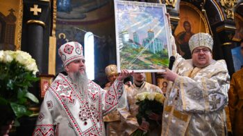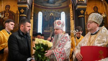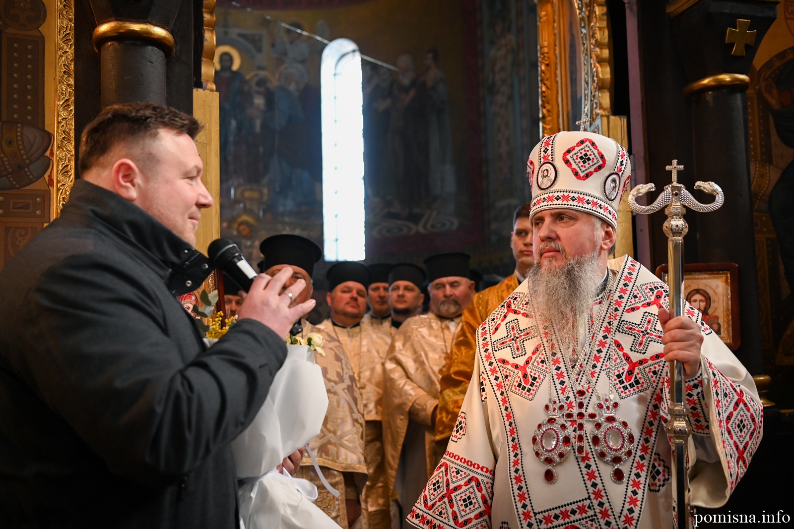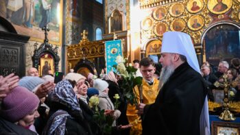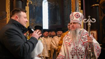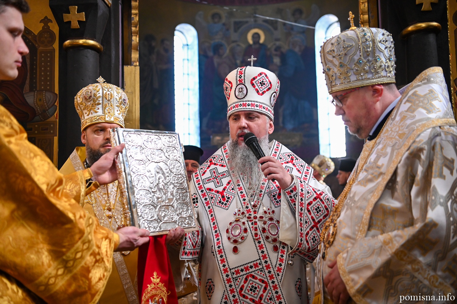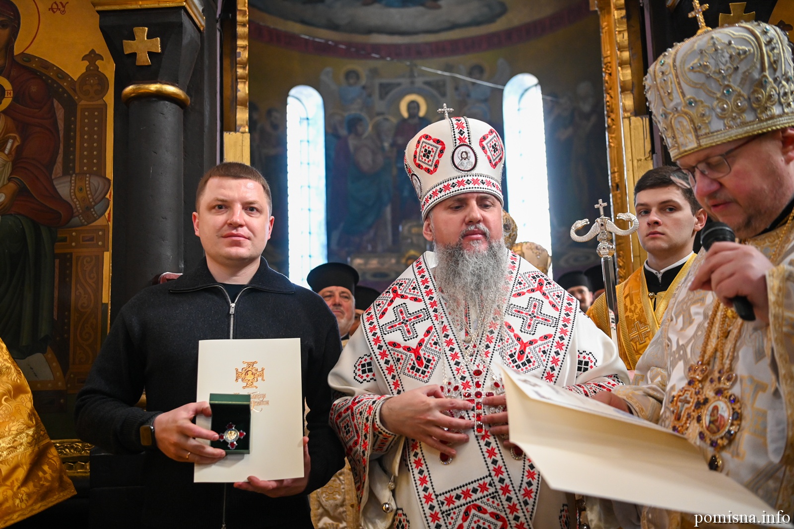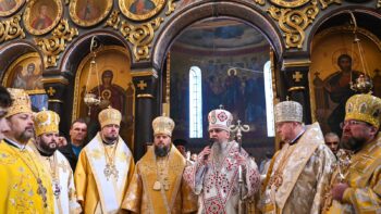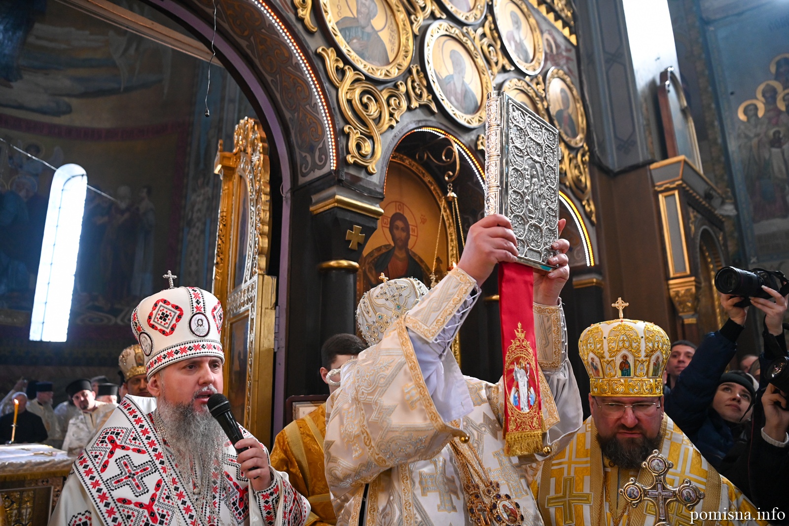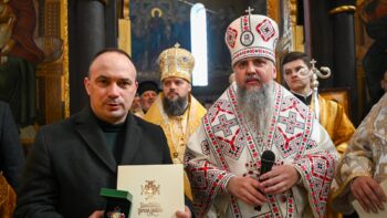 Наприкінці Божественної літургії Предстоятель привітав громаду з визначною подією – поверненням Української Церкви до древнього княжого Успенського собору, подарував храму напрестольне Євангеліє, архієпископу Матфею – памʼятну панагію та відзначив благодійників церковними нагородами.